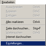 1. Klicken Sie in Netscape zunächst auf den Menü- punkt Bearbeiten. Es erscheint ein Pulldown-Menü, in dem Sie auf Einstellungen klicken.